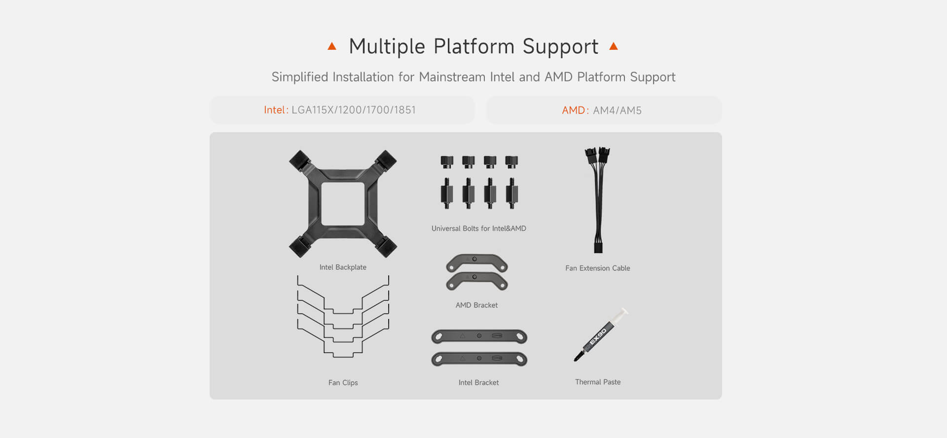 ・部品点数も少なく、スタッドナットなどIntelとAMDの両プラットフォーム間で一部の部品の共通化、シンプルで便利なセットアップを実現