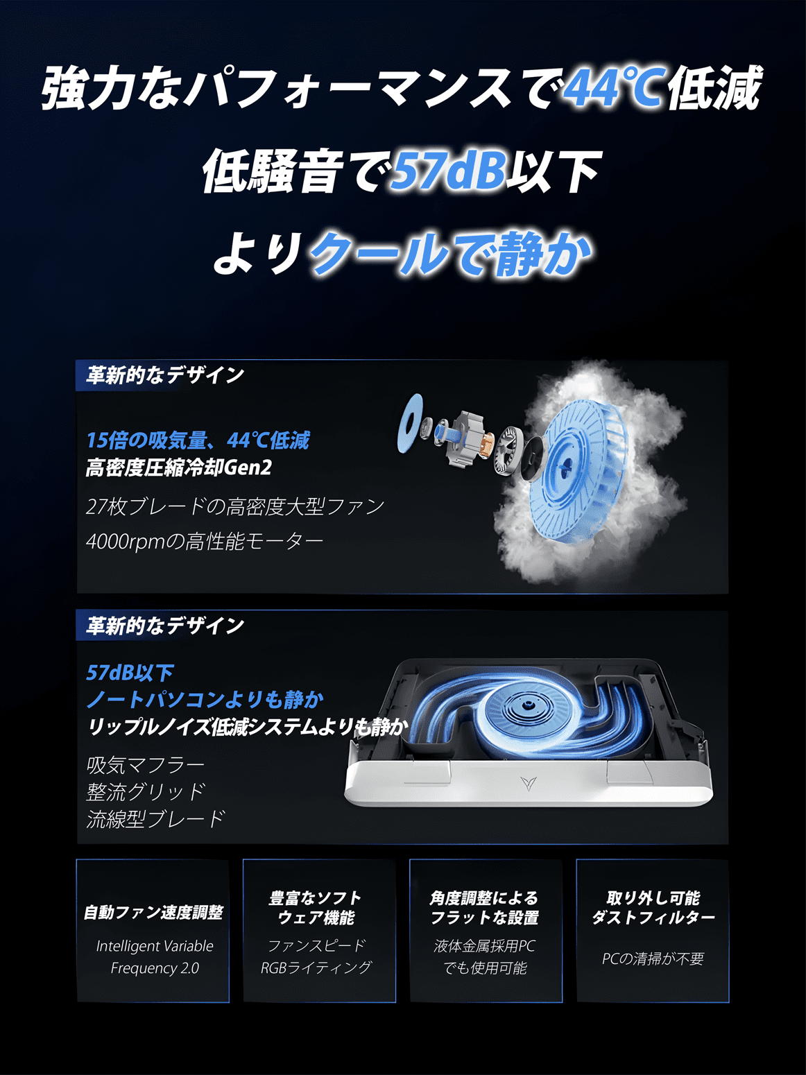 ・ゲームプレイ中/待機、使用状況に応じて風量を自動調整・温度を自動制御2.0。