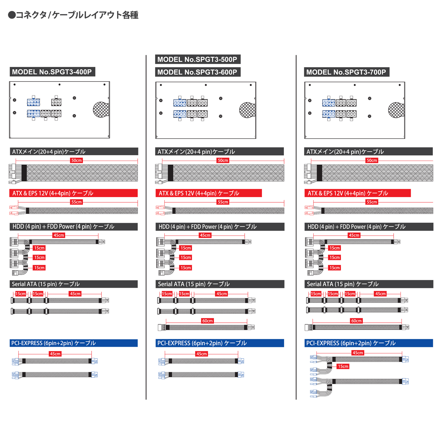 | コネクタ数 | ATXメイン 20+4pin:1本 ATX12V 4+4pin:1本 PCI-EXPRESS 6+2pin:400/500/600W : 2本 700W : 4本 FDD用 4pin:1本 HDD用 4pin:3本 S-ATA 15pin:400W:6本 / 500・600W:7本 / 700W:9本 |